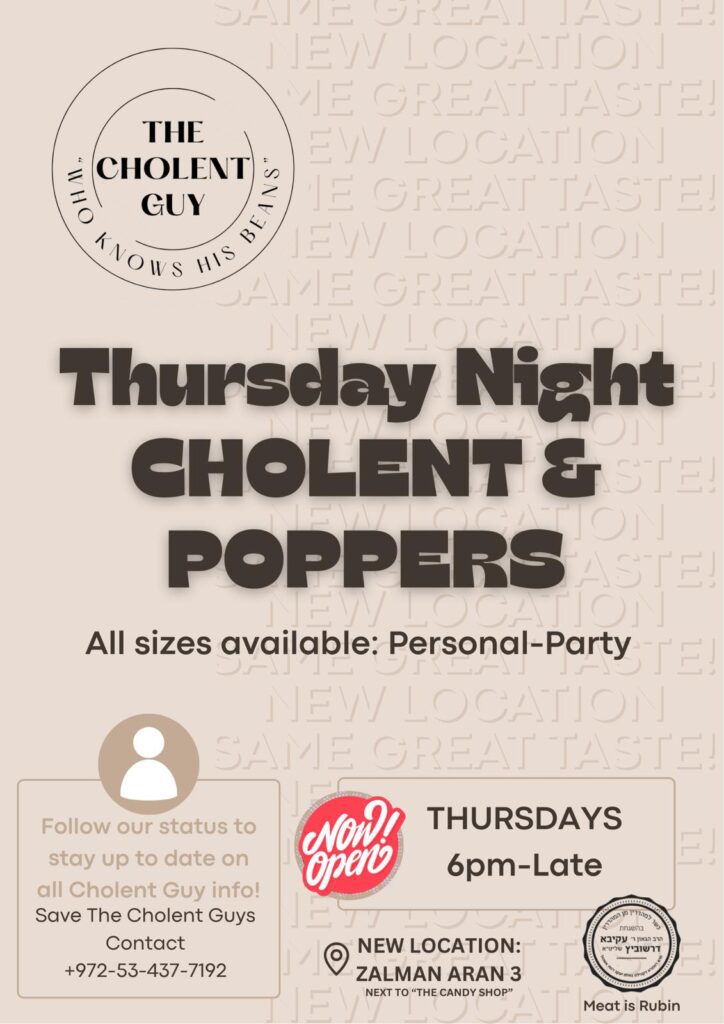 The Cholent Guy is open in Ramat Eshkol every Thursday night from 6-11 PM, serving you an American style Leil Shishi to bring you a taste of home. Come stop by our stand to pick up our famous Cholent, Kugel, Poppers, Deli roll or Yapchik. We offer delivery as well to surrounding areas. Our Thursday […]