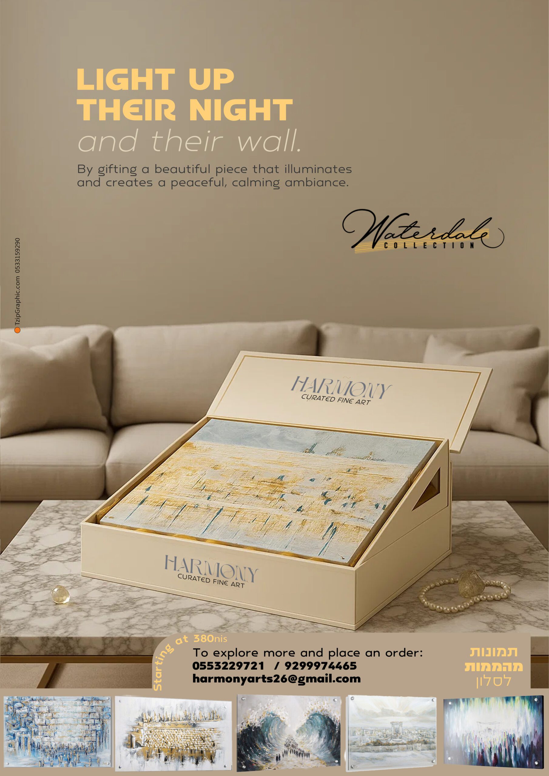 Harmony Curated Fine Art is here to offer Waterdale Art in Israel! You can print on glass,wood or canvas in the size that suits your wall. Reach out to us to see our catalog and live samples.