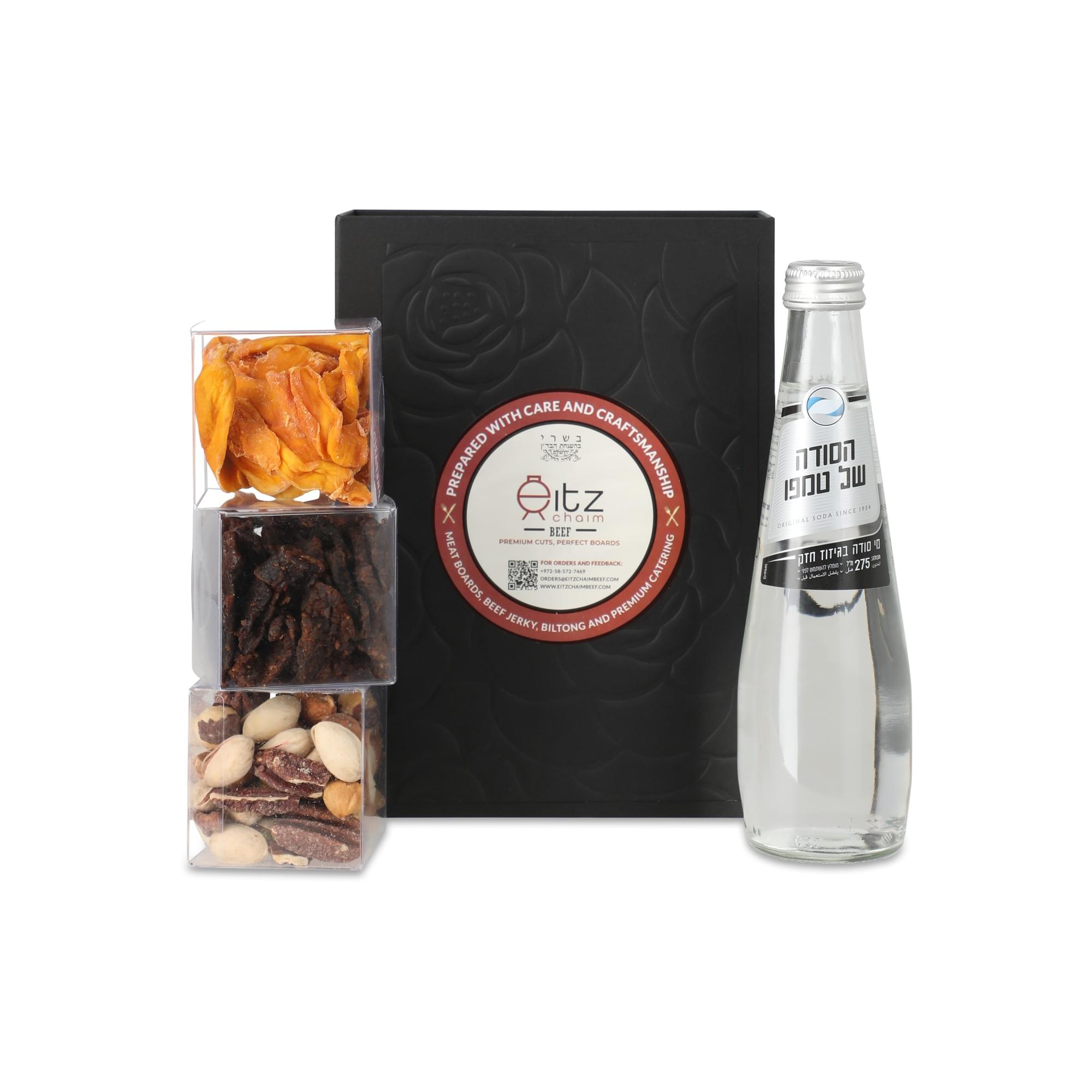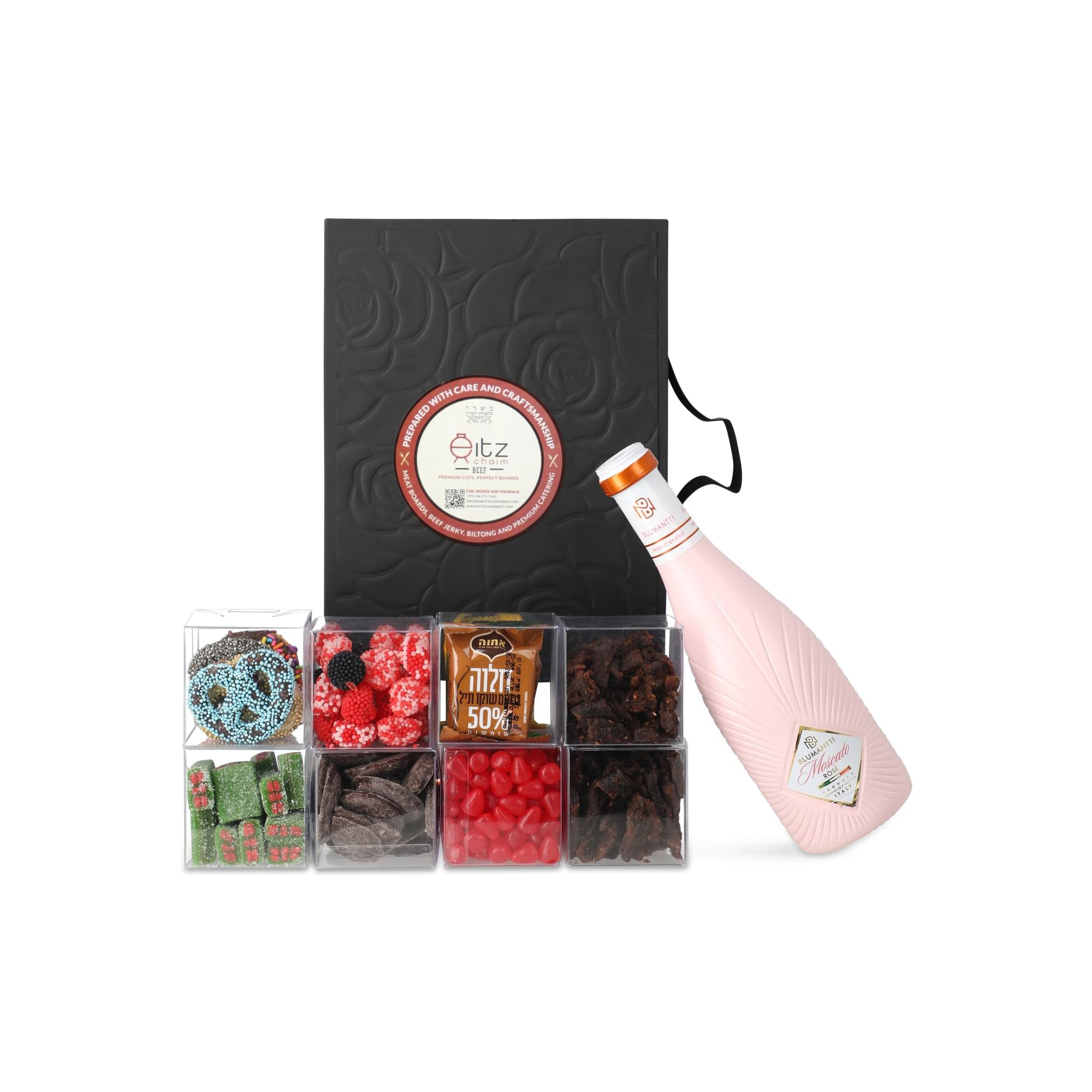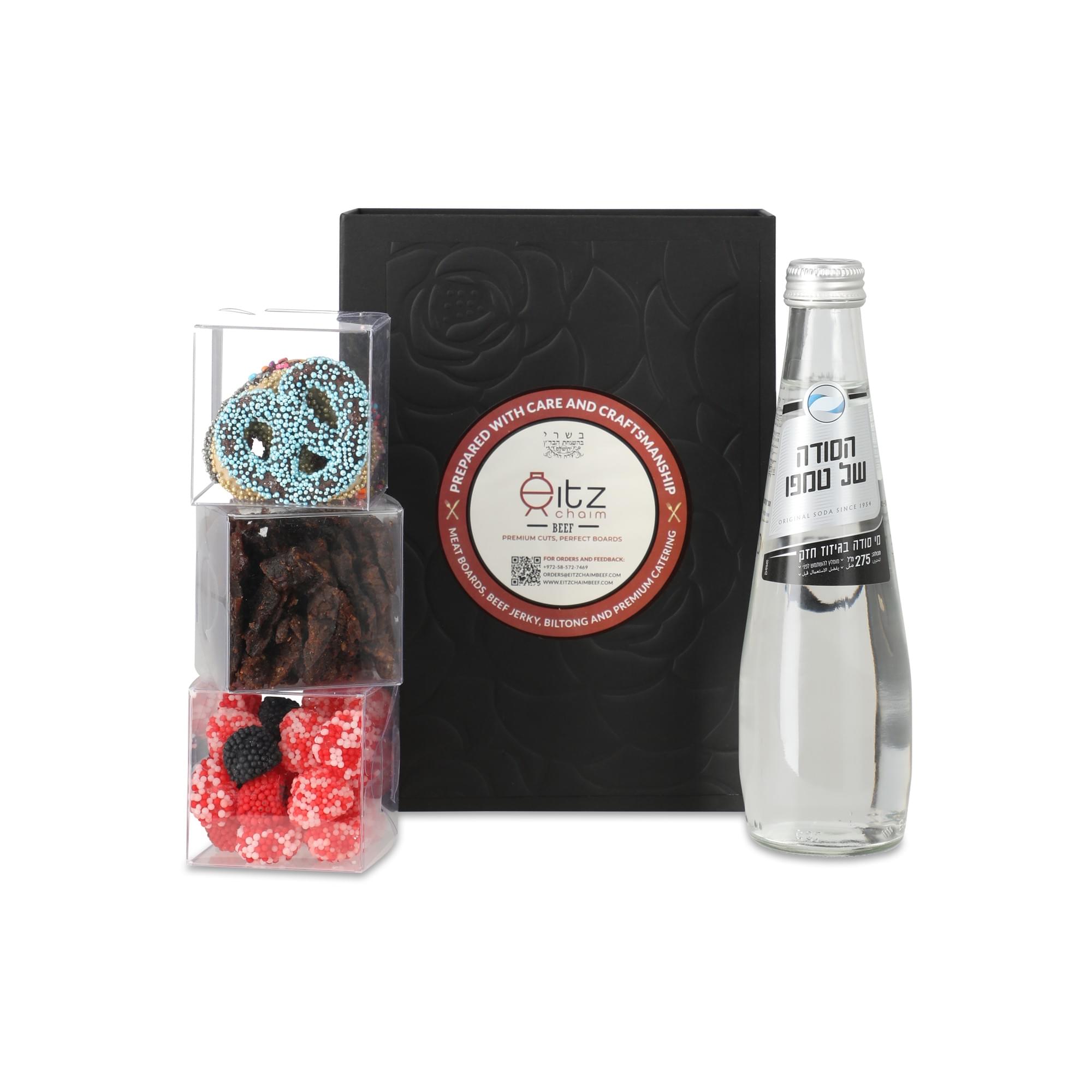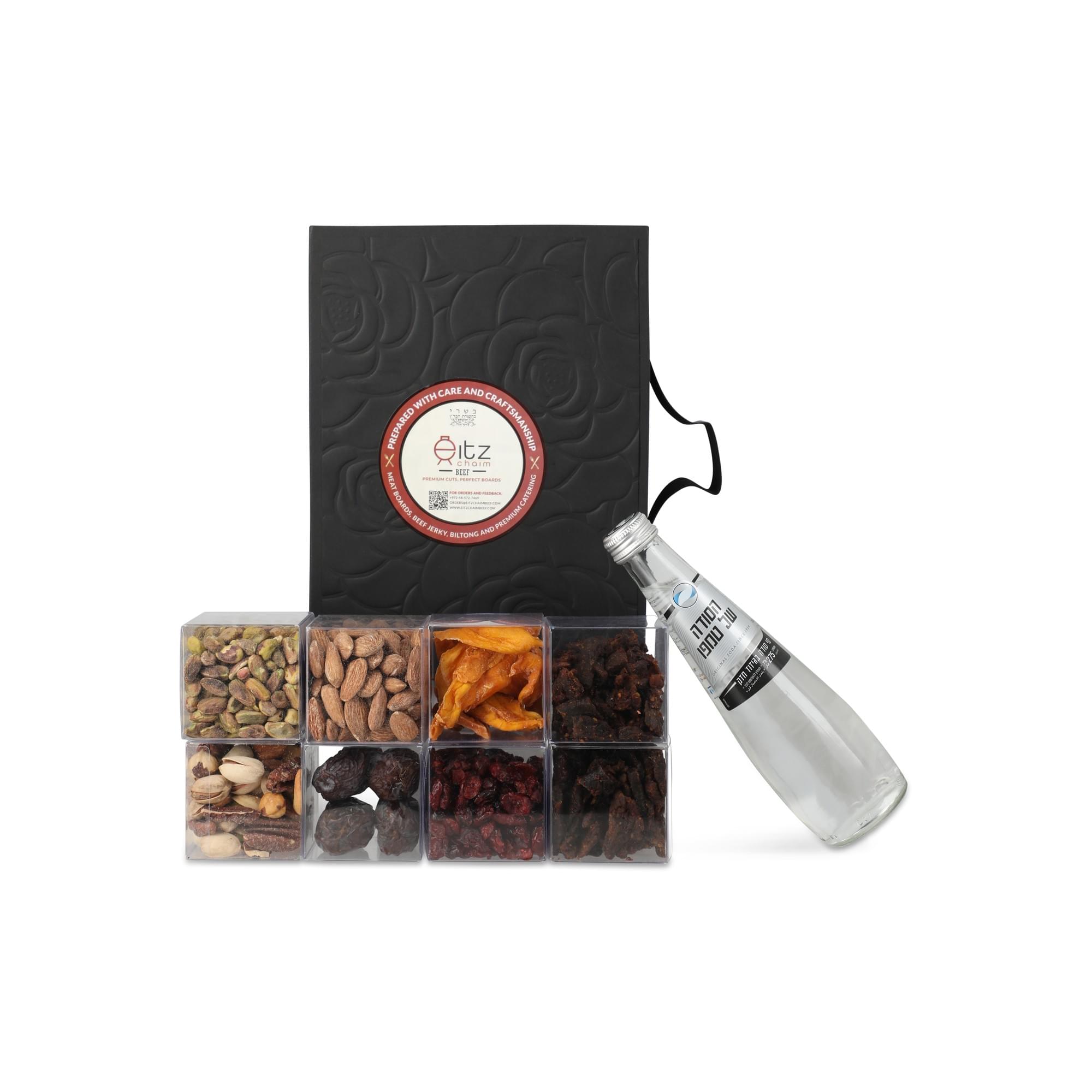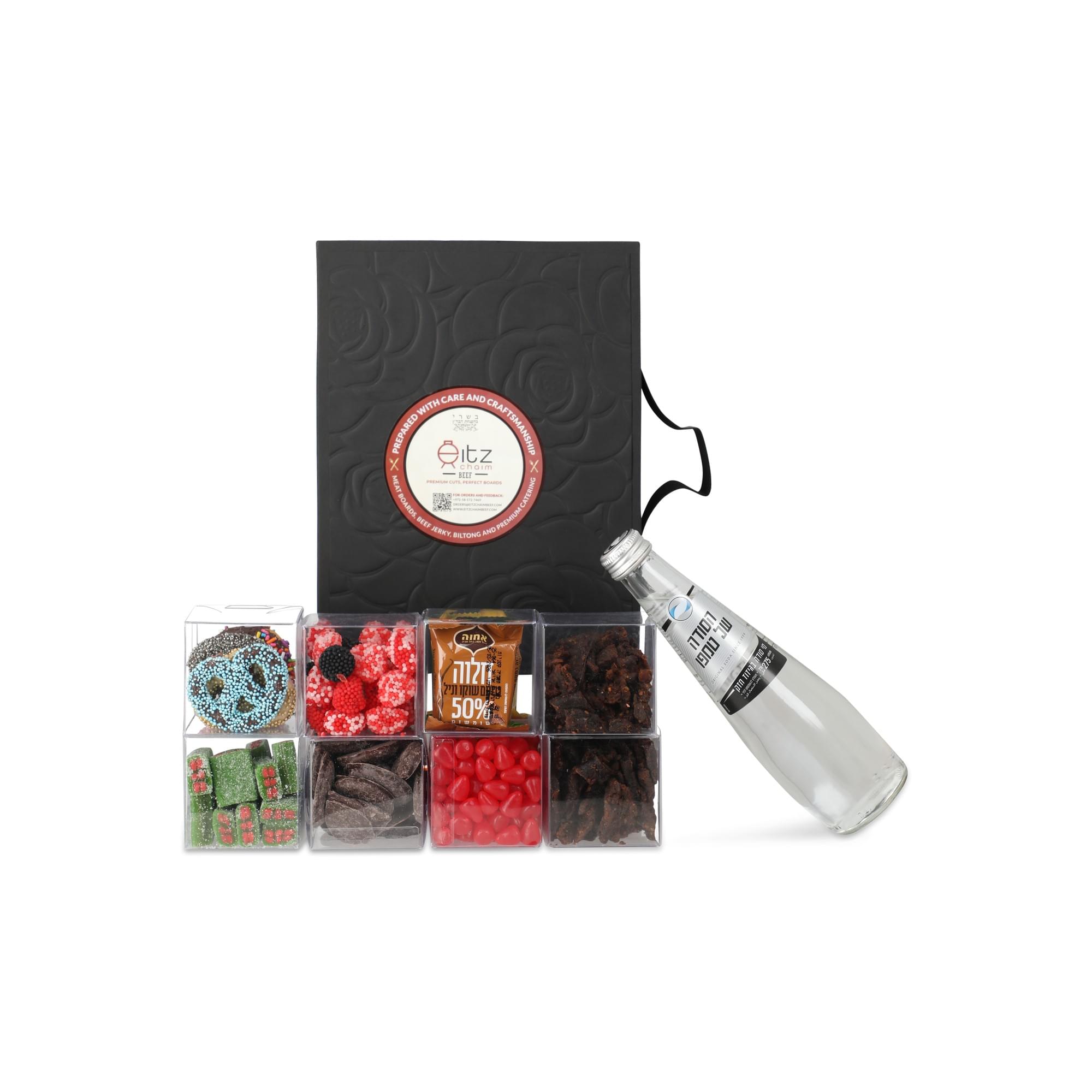 A beautiful magnetic black gift box, elegantly packaged with exquisite cubes, featuring ECB Jerky alongside your choice of either a Candy Selection or a Fruit & Nut Selection. The Candy Selection includes chocolate-covered pretzels, Israeli halva, watermelon sours, raspberry candy, jelly beans, and mint chocolate, while the Fruit & Nut Selection features Medjool dates, cranberries, dried mango, mixed nuts, peeled pistachios, and salted almonds. Exact items may vary based on availability.