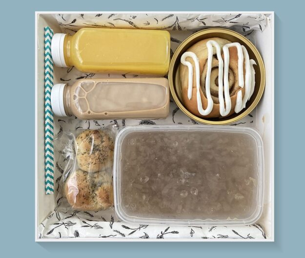 1 Cinnamon bun with cream cheese frosting * Onion Soup * Garlic Knots * Small iced coffee * Orange juice