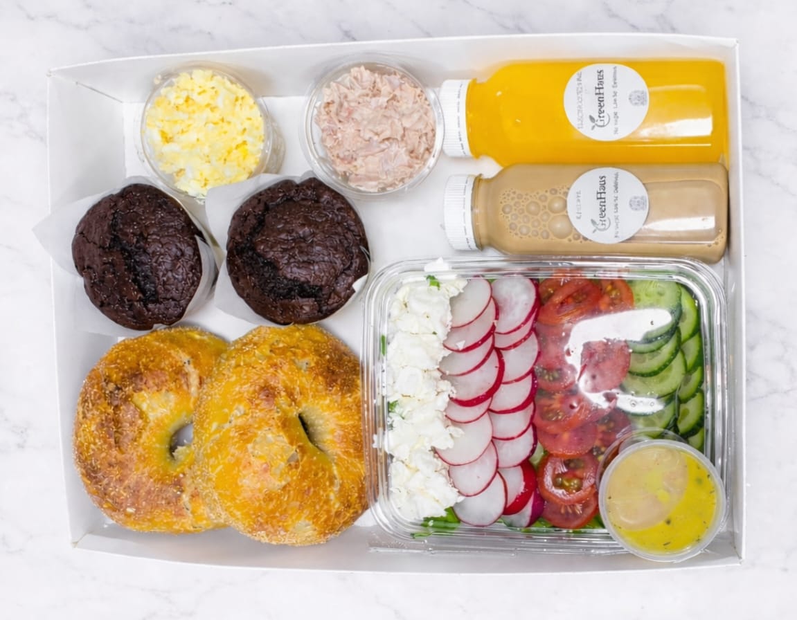 Share the goodness with our Healthy Deluxe Lunch Box for Two, crafted for freshness and flavor. Enjoy two electrolyte drinks or iced coffees, two wholesome bagels, one crisp salad to share, and your choice of two flavorful spreads. Perfect for a healthy, satisfying lunch date or a light meal on the go!