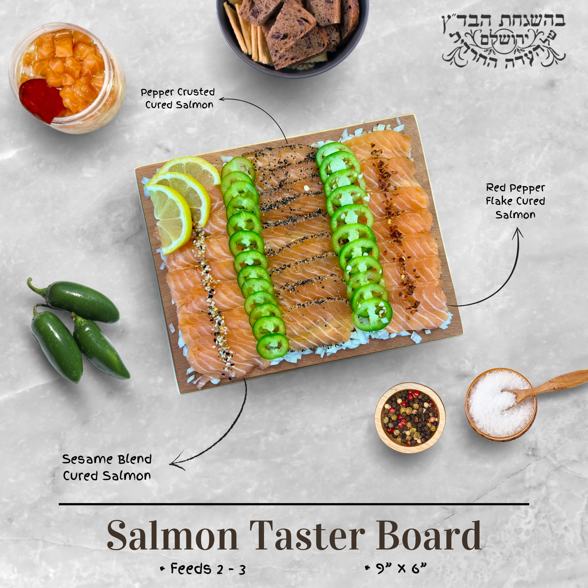 Whats on the board: An elegant selection featuring our original cured salmon, pepper-crusted salmon, and beet-cured salmon, artfully presented with a vibrant array of fresh vegetables, aromatic herbs, and delicate spices. Perfect for a Shabbos seudah, erev shabbos toameha, or small kiddush. Serving 6-8 people.