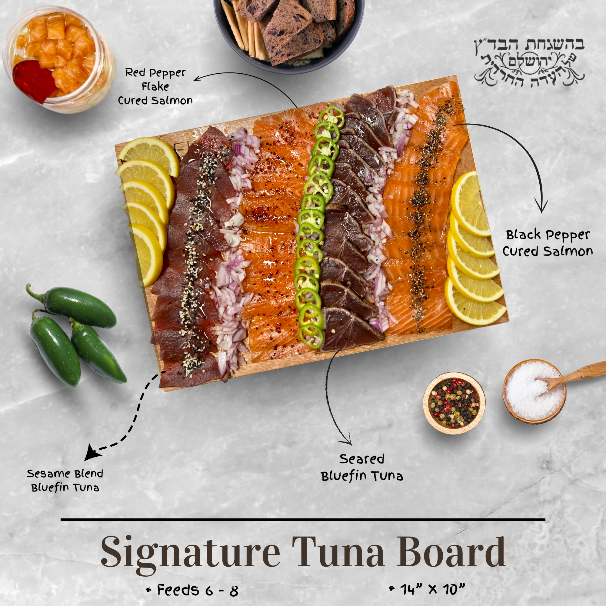 Whats on the board: An abundant presentation featuring our original cured salmon, pepper-crusted salmon, beet cured salmon, seared tuna, sesame blend tuna  artfully arranged with a vibrant array of seasonal vegetables, fresh herbs, and aromatic spices. Designed to impress, this luxurious board makes a striking centerpiece for any gathering such as a kiddush or large shabbos seudah, serving 9-12