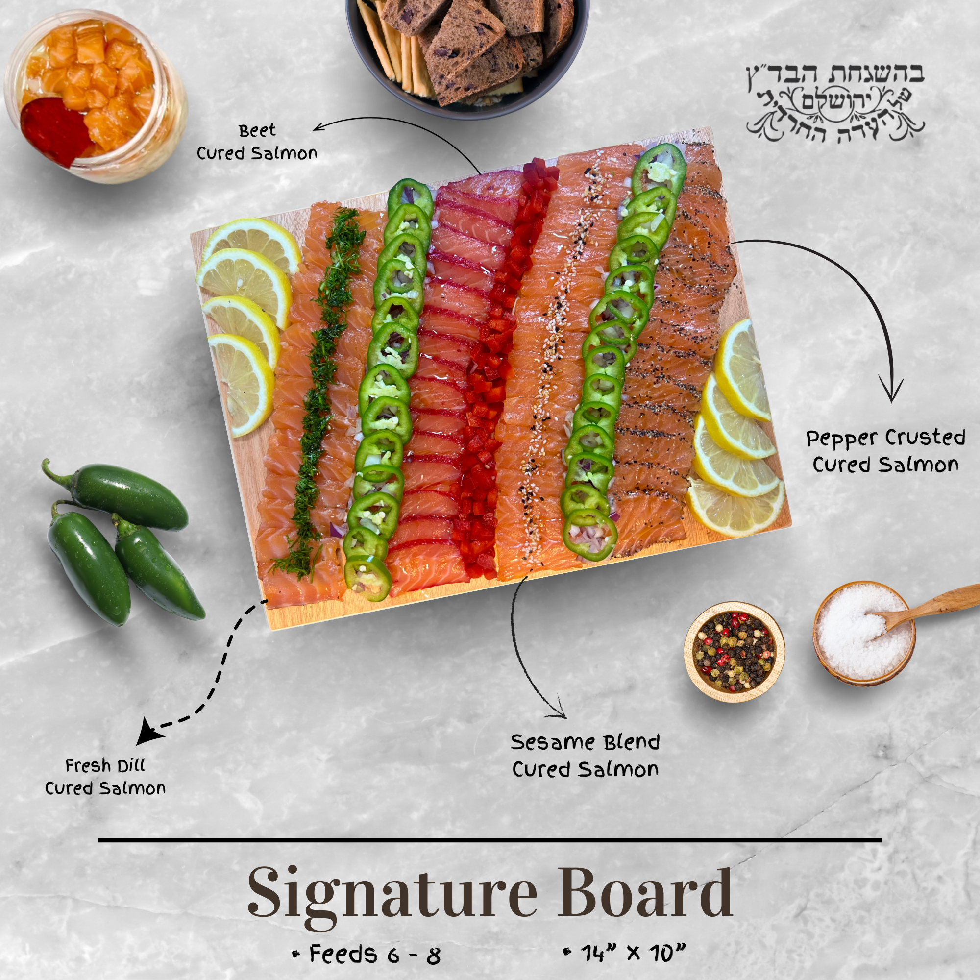 Whats on the board: An elegant selection featuring our original cured salmon, pepper-crusted salmon, and beet-cured salmon, artfully presented with a vibrant array of fresh vegetables, aromatic herbs, and delicate spices. Perfect for a Shabbos seudah, erev shabbos toameha, or small kiddush. Serving 6-8 people.