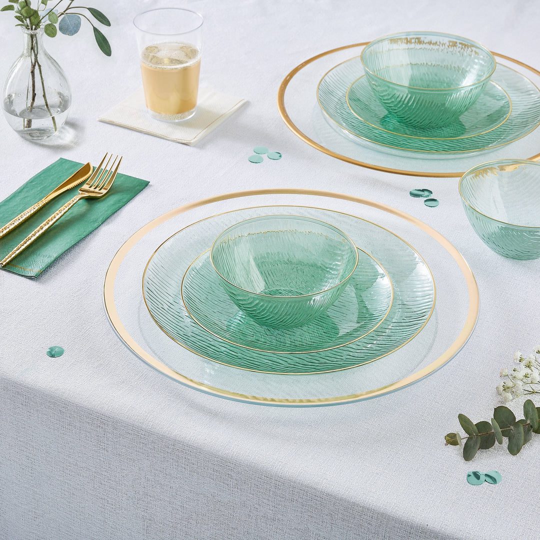 Round 7.5″ Waterfall Transparent Sage and Gold Appetizer Plastic Plates | 24 Plates