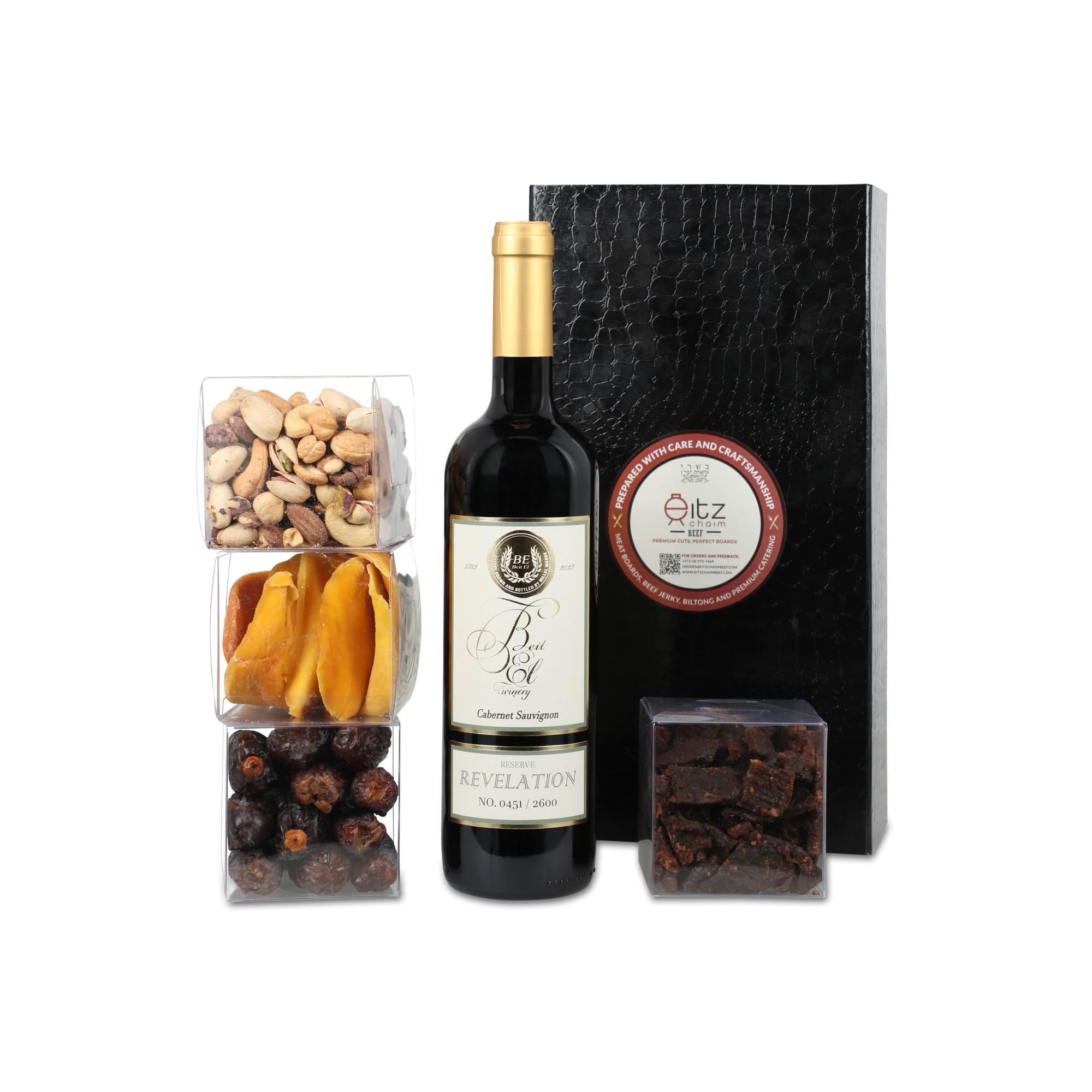 A refined Mishloach Manos experience featuring a bottle from Beit El Winery, beautifully presented in a magnetic black gift box with ECB jerky and your choice of curated pairings. Each box is thoughtfully assembled with candy or premium fruit and nuts, creating the perfect balance of bold wine, savory richness, and elevated indulgence. Elegant, generous, and ready to gift – this is a wine box designed to impress.
