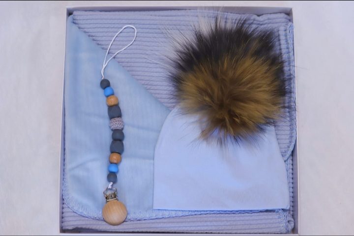 Newborn Bumper box: Dummy chain, Blanket, Hat, Babygrow.