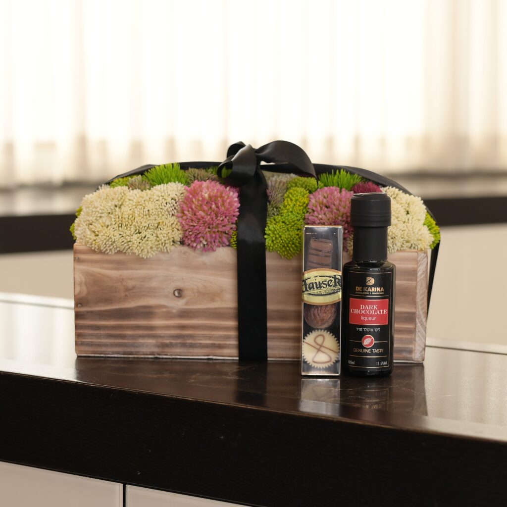 Mishloach Manos | Exclusive Sedum Flower Arrangement, Liquor and Praline Chocolates
